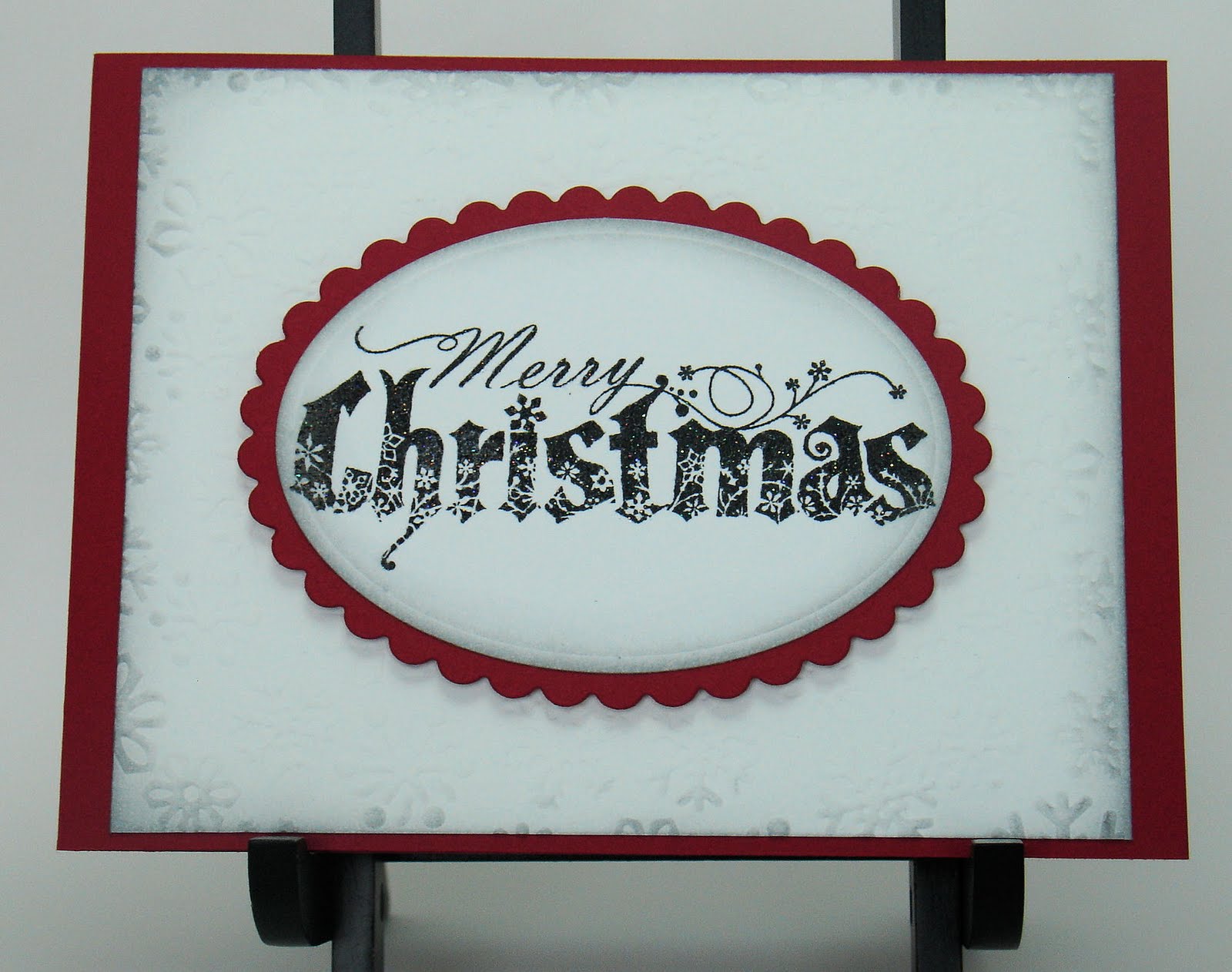 Okay, please excuse my horrible photo... I couldn't get my hands to steady (must be all the excitement, or lack of sleep!) to get a decent pic and this was the only one that turned out! You can't tell, but I did emboss the cardstock with a Fiskars snowflake template... I used my new Snowflake Spellbinder die, my new Marvy scallop punch (soooo lovin' those!), a sentiment from Studio G, Spellbinder scallop nesties, Bazill cardstock and Jacob Santa, beautifully coloured with watercolour pencils by the very talented Kelly :)... oh, and you can't forget the stickles!!!!
